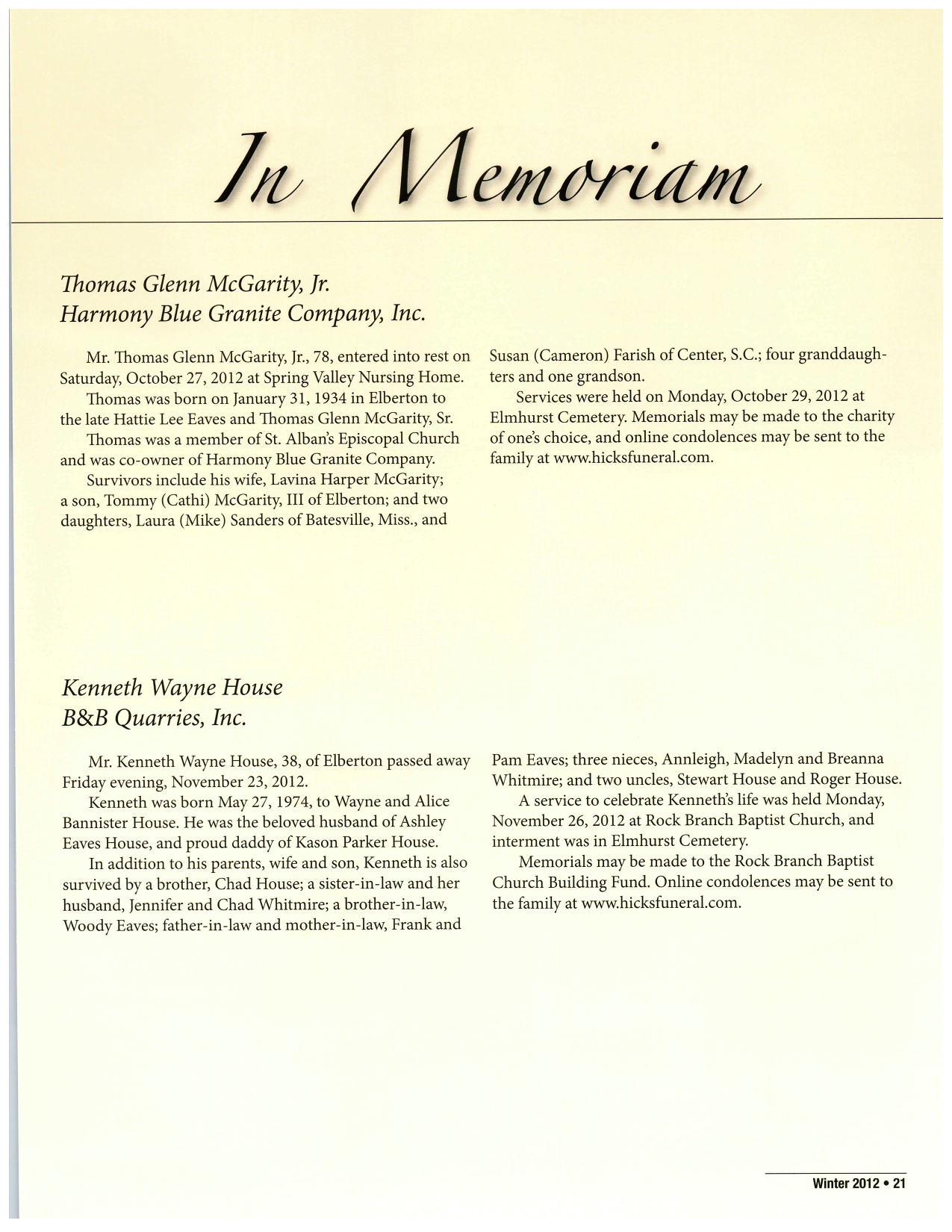 Harmony Blue Granite Company, Inc. Mr. Thomas Glenn McGarity, Jr., 78, entered into rest on Saturday, October 27, 2012 at Spring Valley Nursing Home.