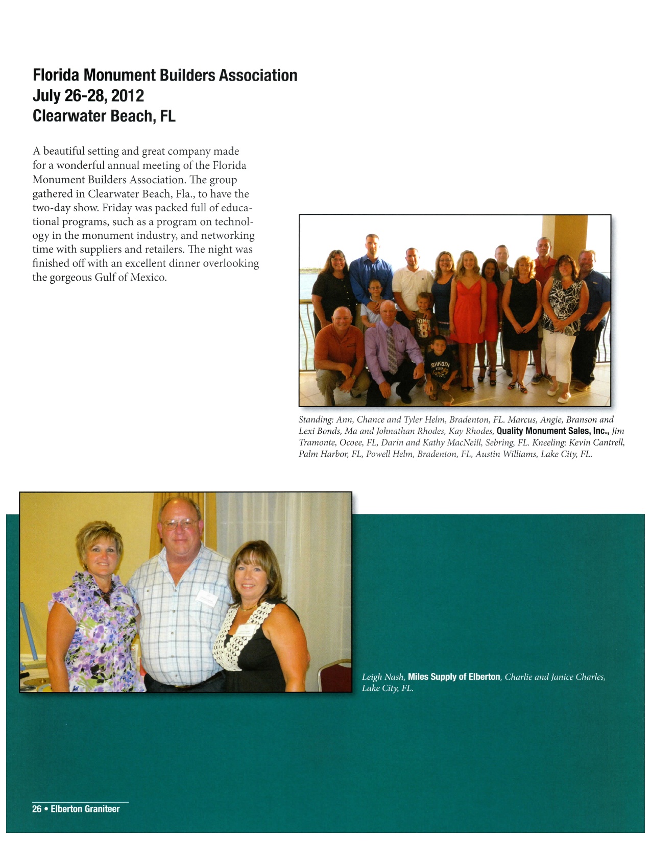 Clearwater Beach, FL A beautiful setting and great company made for a wonderful annual meeting of the Florida Monument Builders Association. The group gathered in Clearwater Beach, Fla., to have the two-day show. Friday was packed full of educational programs, such as a program on technology and QR Codes in the monument industry, and networking time with suppliers and retailers. The night was finished off with an excellent dinner overlooking the gorgeous Gulf of Mexico.