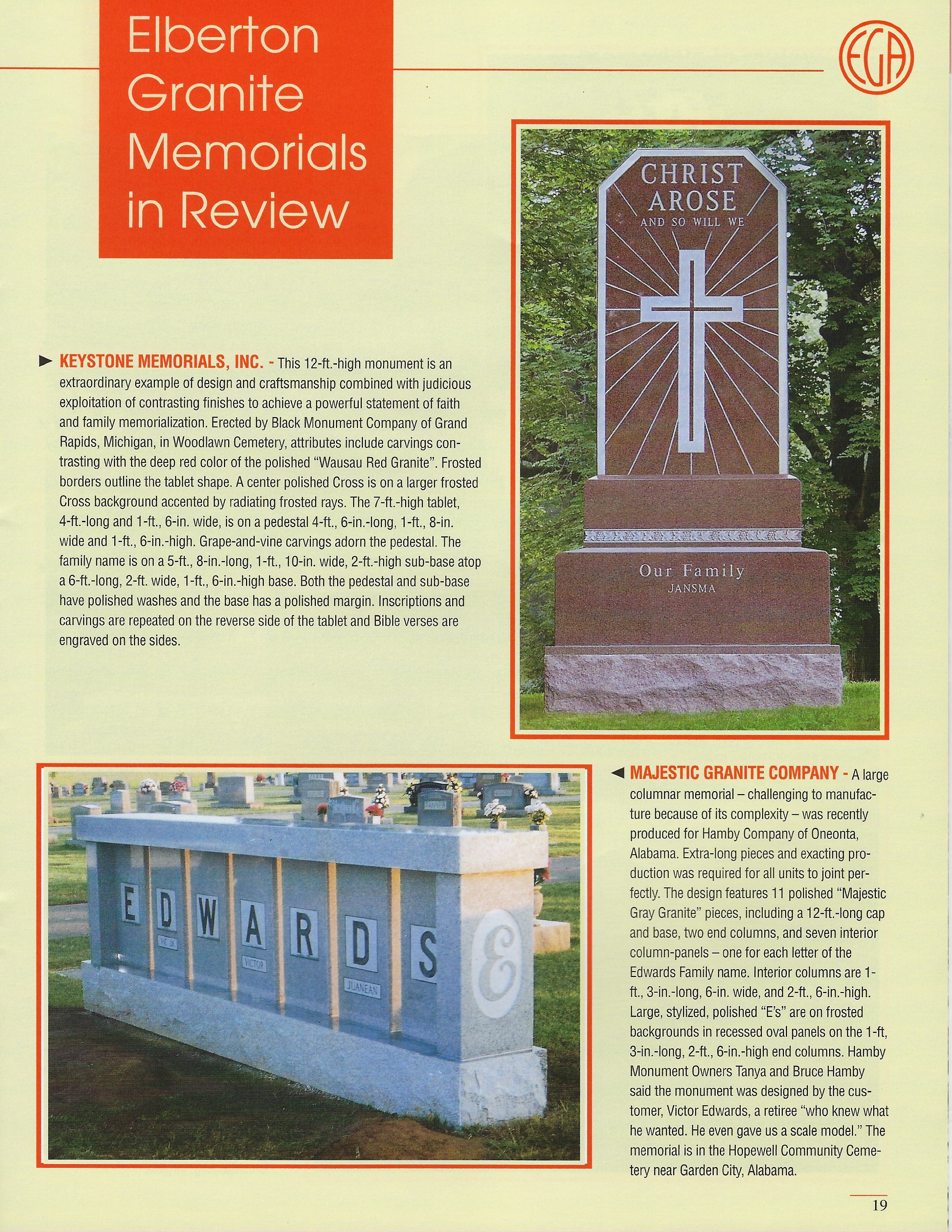 memory of a deceased young physician, Dr. William F. Lombard Ill. A caduceus, symbolic of the medical profession, and Dr. Lombard's name engraved on an Open Book panel, are on the smaller, 2-ft., 6-in.-long tablet and the names of his parents, Mr. & Mrs. William Lombard, Jr., of Greensboro, Georgia, are on a 4-ft., 2-in.-long tablet. Both tablets are 2-ft., 6-in.-high. The monuments are separated by a vase with a Praying Hands carving. The family name is on a polished chamfer on the base. The large cemetery plot at the rural Walker United Methodist Church Cemetery near Greensboro also includes a bench and a lawn-level marker with information about Dr. Lombard. KEYSTONE MEMORIALS, INC. -This 12-ft.-high monument is an extraordinary example of design and craftsmanship combined with judicious exploitation of contrasting finishes to achieve a powerful statement of faith and family memorialization. Erected by Black Monument Company of Grand Rapids, Michigan, in Woodlawn Cemetery, attributes include carvings contrasting with the deep red color of the polished "Wausau Red Granite". Frosted borders outline the tablet shape. A center polished Cross is on a larger frosted Cross background accented by radiating frosted rays. The 7-ft.-high tablet,4-ft.-long and 1-ft., 6-in. wide, is on a pedestal 4-ft., 6-in.-long, 1-ft., 8-in. wide and 1-ft., 6-in.-high. Grape-and-vine carvings adorn the pedestal. The family name is on a 5-ft., 8-in.-long, 1-ft., 10-in. wide, 2-ft.-high sub-base atop a 6-ft.-long, 2-ft. wide, 1-ft., 6-in.-high base. Both the pedestal and sub-base have polished washes and the base has a polished margin. Inscriptions and carvings are repeated on the reverse side of the tablet and Bible verses are engraved on the sides. MAJESTIC GRANITE COMPANY - A large columnar memorial - challenging to manufacture because of its complexity- was recently produced for Hamby Company of Oneonta, Alabama. Extra-long pieces and exacting production was required for all units to joint perfectly. The design features 11 polished "Majestic Gray Granite" pieces, including a 12-ft.-long cap and base, two end columns, and seven interior column-panels - one for each letter of the Edwards Family name. Interior columns are 1- ft., 3-in.-long, 6-in. wide, and 2-ft., 6-in.-high. Large, stylized, polished "E's" are on frosted backgrounds in recessed oval panels on the 1-ft, 3-in.-long, 2-ft., 6-in.-high end columns. Hamby Monument Owners Tanya and Bruce Hamby said the monument was designed by the customer, Victor Edwards, a retiree "who knew what he wanted. He even gave us a scale model." The memorial is in the Hopewell Community Cemetery near Garden City, Alabama. SOUTHERN GRANITE COMPANY, INC. - This appealing, contemporary-style memorial was fabricated from all-polished "Jet Black Granite". The pleasingly proportioned modernistic elements of the memorial, commemorating a deceased Bowling Green, Kentucky, law enforcement officer, includes a shallow serpentine top and convex ends - all with chamfered edges. A deep check at the bottom adds to the contemporary look. Ornamentation, in addition to interlocking wedding bands, includes a bronze Fraternal Order of Police emblem, 6 ¼-in. in diameter, inset in the center of the monument. The monument was erected in Bowling Green Gardens by Bowling Green Monument Company. TRINITY GRANITE COMPANY, INC.- This impressive "North American Pink Granite" monument marks the large estate lot of the Joel Anderson Family in Elberton's Forest Hills Memorial Park. The all-polished, 8-ft.long, 2-ft., 6-in.-high tablet is on a 10-ft., 6-in.-long base and incorporates sand sculptured Praying Hands on a frosted oval background recessed ½-in. Additional carving includes a frosted-finish Cross and ribbon band outlining the oval top and shape-carved cultured roses. The late Joel Anderson, Jr., is interred in the lot. He was the husband of long-time Elbert County Court Clerk Pat Anderson and the son of retired Granite Industry craftsman Joel Anderson, Sr. WELCH'S GRANITE COMPANY, INC. - Expeditious use of contrasting colors of granite and clever use of angular, straight lines of design combine to make this memorial an outstanding creation. The center tablet, base, and vases were fabricated from polished "Flash Black Granite" and the wings from polished "Mt. Airy Granite". The 1-ft., 8-in.-long, 3-ft., 4-in.high tablet features a gabled top and a sand sculptured cultured rose on a textured oval background panel recessed ½in. The family name is on a polished chamfer on the base. Individual names are on the steeply tapered wings. The memorial was erected by Blue Ridge Monument of Salem, Virginia, in the Sunset Cemetery at Christianburg, Virginia. COLONIAL GRANITE COMPANY - Craftsmen employed expert stone carving to produce this memorial reflecting young Cameron Paxton's love for mountain climbing and the peaks around Franklin, North Carolina. Gene Shields of Shields Memorial Service in Franklin, family members, Colonial officials, and The Drafting Shoppe design/drafting firm in Elberton, all collaborated on the design providing a rustic look symbolizing the mountains. Stylized lettering and carving is on the steeled panel which is recessed three-inches. A sandblown carving depicts Cameron climbing a rocky cliff. Supreme Granite Company manufactured the turned vase mounted in a cutout in the left corner. The 4-ft., 6-in. Long, 3- ft., 6-in.-high, "American Dark Blue Granite" memorial is in the Louisa Methodist Church Cemetery near Franklin. JOHNSON & SON MEMORIALS, INC. – The Johnson firm recently manufactured a noteworthy, picturesque memorial complex for the cemetery lot of the Joseph A. Hall Family in Southwest Georgia. The polished, "Royal Jet Black Granite" units consist of three large, oval monuments set on a two-piece base 18-ft. Long, four grave ledgers, a bench, and a vase. The cemetery lot is enclosed by "Elberton Blue Granite" coping. The center, 5-ft., 6-in. -long tablet includes etc
