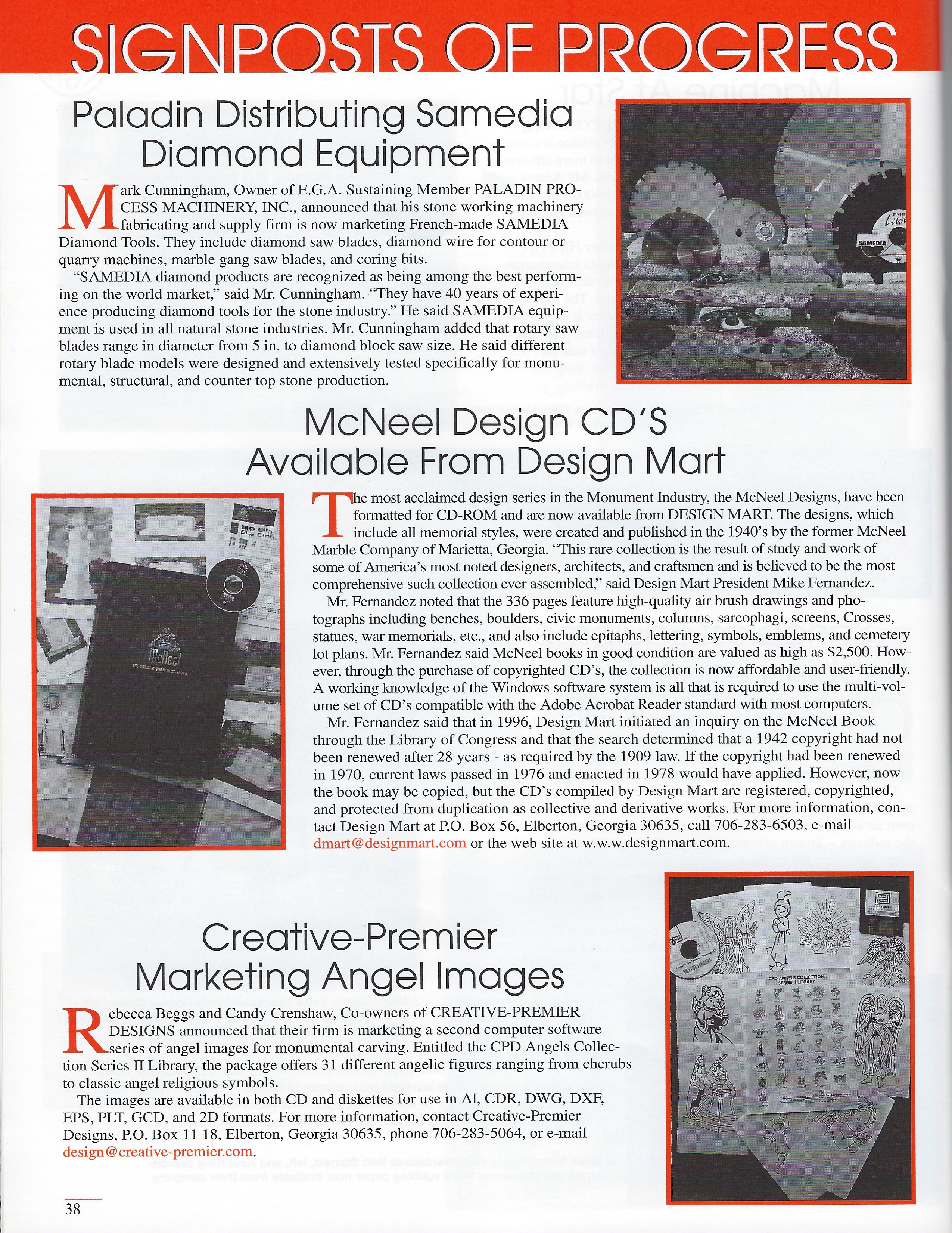 Mr. Fernandez noted that the 336 pages feature high-quality air brush drawings and photographs including benches, boulders, civic monuments, columns, sarcophagi, screens, Crosses, statues, war memorials, etc., and also include epitaphs, lettering, symbols, emblems, and cemetery lot plans. Mr. Fernandez said McNeel books in good condition are valued as high as $2,500. However, through the purchase of copyrighted CD's, the collection is now affordable and user-friendly. A working knowledge of the Windows software system is all that is required to use the multi-volume set of CD's compatible with the Adobe Acrobat Reader standard with most computers.