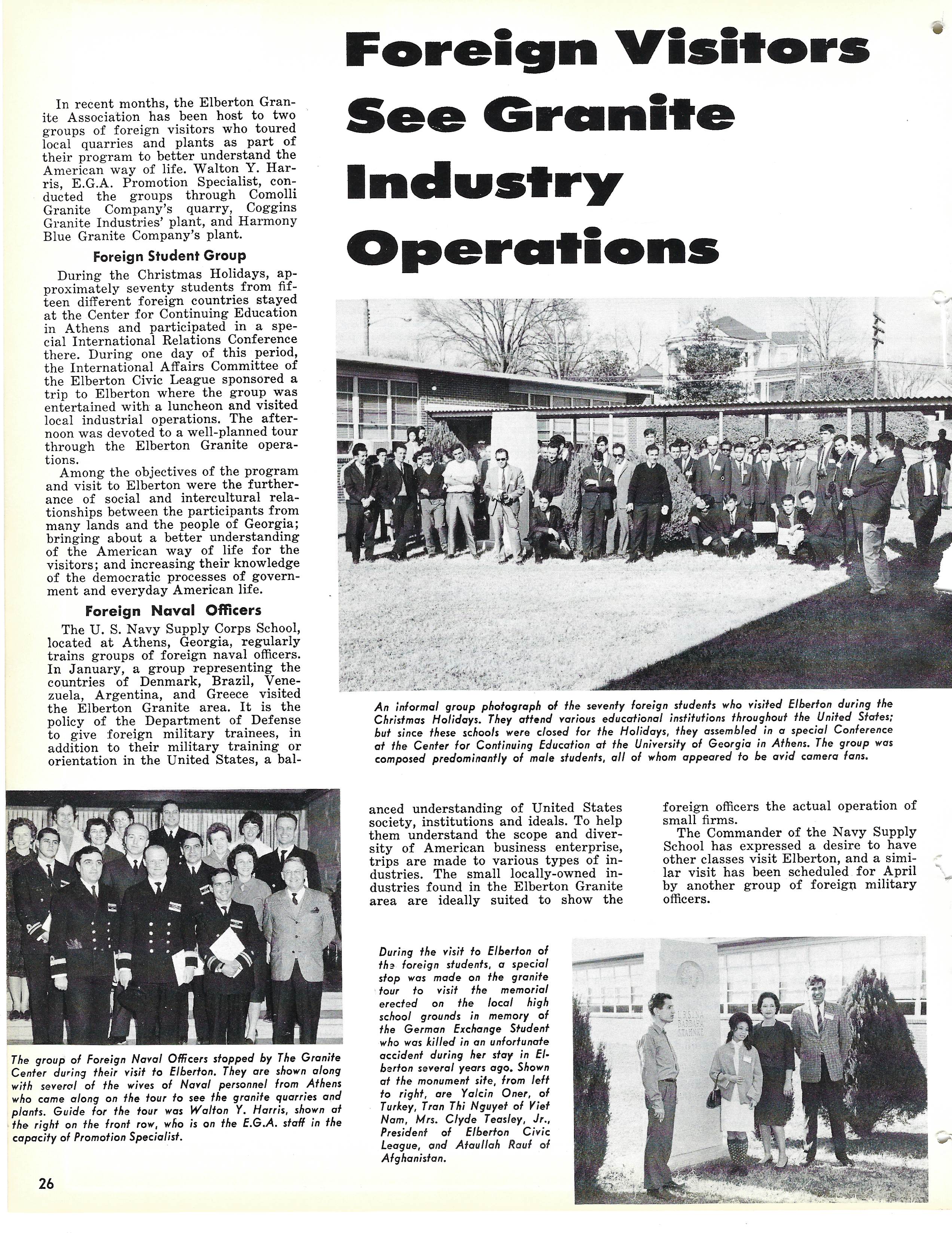 During the Christmas Holidays, approximately seventy students from fifteen different foreign countries stayed at the Center for Continuing Education in Athens and participated in a special International Relations Conference there. During one day of this period, the International Affairs Committee of the Elberton Civic League sponsored a trip to Elberton where the group was entertained with a luncheon and visited local industrial operations. The afternoon was devoted to a well-planned tour through the Elberton Granite operations. Among the objectives of the program and visit to Elberton were the furtherance of social and intercultural relationships between the participants from many lands and the people of Georgia; bringing about a better understanding of the American way of life for the visitors; and increasing their knowledge of the democratic processes of government and everyday American life. Foreign Naval Officers The U. S. Navy Supply Corps School, located at Athens, Georgia, regularly trains groups of foreign naval officers. In January, a group representing the countries of Denmark, Brazil, Venezuela, Argentina, and Greece visited the Elberton Granite area. It is the policy of the Department of Defense to give foreign military trainees, in addition to their military training or orientation in the United States, a balanced understanding of United States society, institutions and ideals. To help them understand the scope and diversity of American business enterprise, trips are made to various types of industries. The small locally-owned industries found in the Elberton Granite area are ideally suited to show the foreign officers the actual operation of small firms. The Commander of the Navy Supply School has expressed a desire to have other classes visit Elberton, and a similar visit has been scheduled for April by another group of foreign military officers. The group of Foreign Naval Officers stopped by The Granite Center during their visit to Elberton. They are shown along with several of the wives of Naval personnel from Athens who came along on the tour to see the granite quarries and plants. Guide for the tour was Walton Y. Harris, shown at the right on the front row, who is on the E.G.A. staff in the capacity of Promotion Specialist. During the visit to Elberton of the foreign students, a special stop was made on the granite tour to visit the memorial erected on the local high school grounds in memory of the German Exchange Student who was killed in an unfortunate accident during her stay in Elberton several years ago. Shown at the monument site, from left to right, are Yalcin Oner, of Turkey, Tran Thi Nguyet of Viet Nam, Mrs. Clyde Teasley, Jr., President of Elberton Civic League, and Ataullah Rauf of Afghanistan. An informal group photograph of the seventy foreign students who visited Elberton during the Christmas Holidays. They attend various educational institutions throughout the United States; but since these schools were closed for the Holidays, they assembled in a special Conference at the Center for Continuing Education at the University of Georgia in Athens. The group was composed predominantly of male students, all of whom appeared to be avid camera fans. Getting the New Year off to a good start by a trip to Elberton, these monument men from Vienna, Illinois, stopped by The Granite Center for a pleasant visit. From Jeff to right are: Paul Francis, Joe Reynolds, and Robert Witt. Bill Kelly, Jeff, E.G.A. Manager, welcomed Mr. and Mrs. Elmer Feis from Hastings, Nebraska, to Elberton. A special inducement for their “Southern trip” was a visit with their daughter and grandchildren in nearby South Carolina. After promising for many years “to come fa Elberton,” Mr. and Mrs. Bill Cerutti, right, of Dodgeville, Wisconsin, finally made it. They are shown of The Granite Center with Horace Harper, left, President of APEX GRANITE COMPANY, INC. Lou Roemer, right, Sales Representative for HARMONY BLUE GRANITE COMPANY, INC., brought retailer R, L. Hoffman, left, from Ashland, Ohio, to E.G:A.’s headquarters during their recent trip to Elberton.